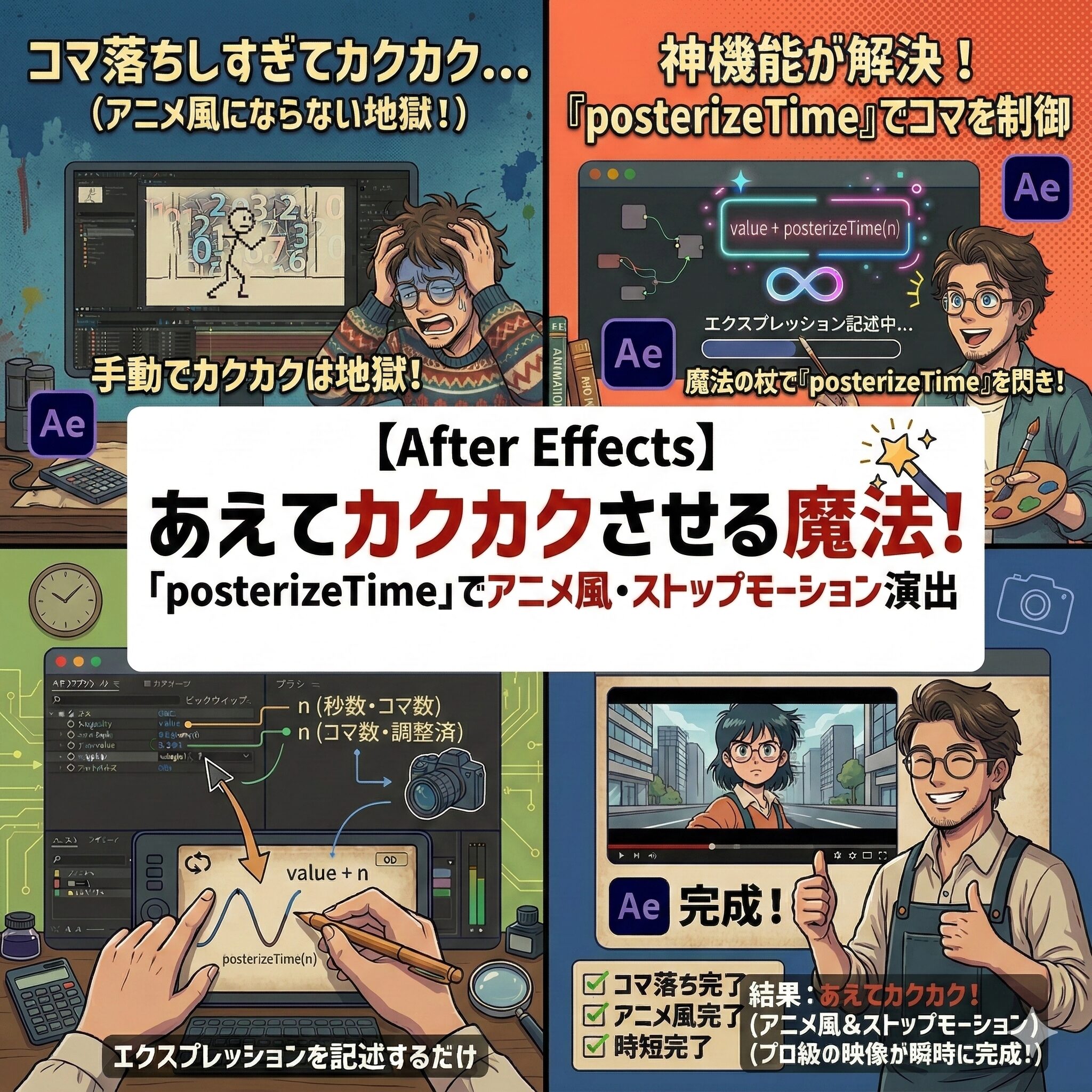 そんな時、あえて『posterizeTime』を使って不完全なカクつきを生み出すことで、視聴者の目を惹きつける「温かみ」が生まれるのです。