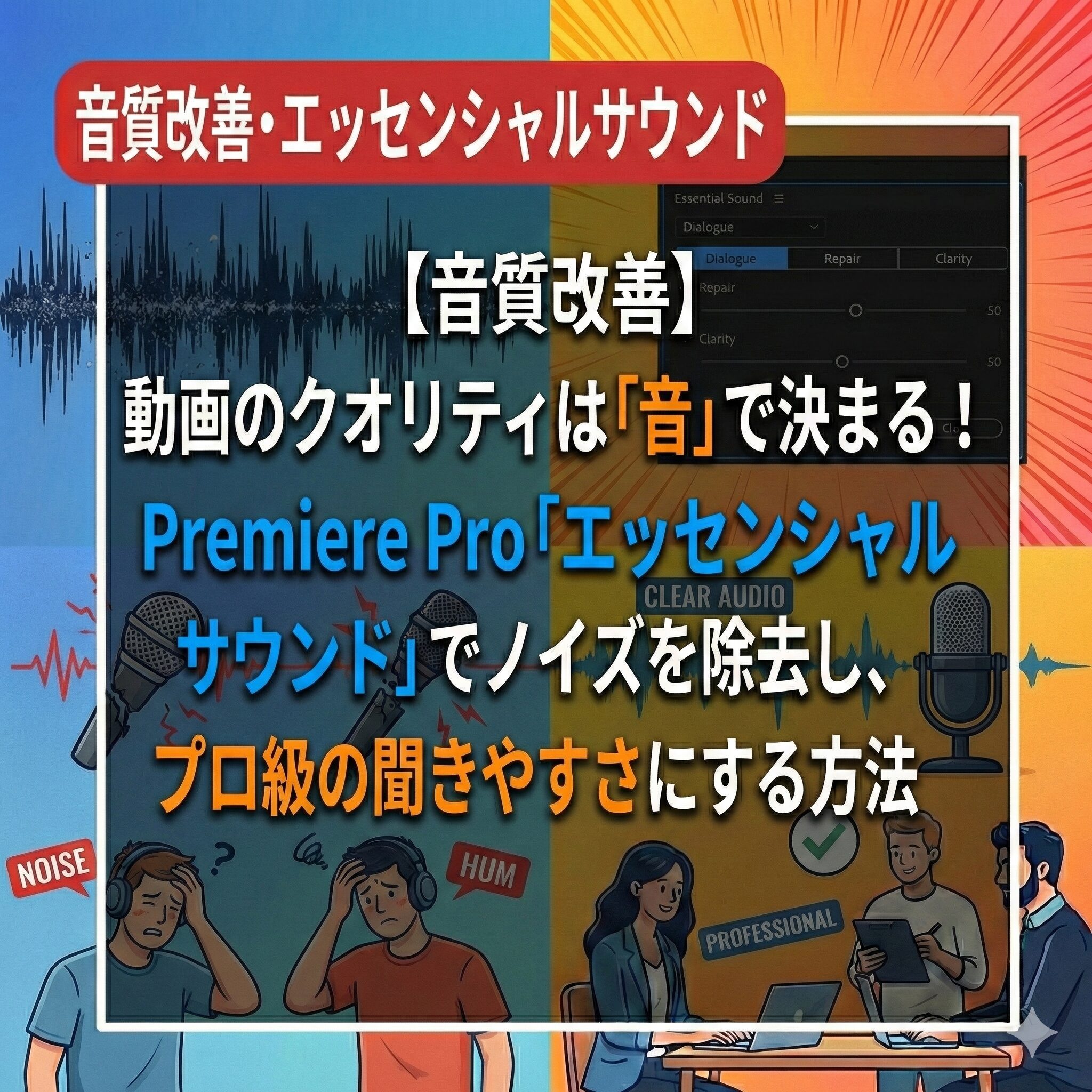 Premiere Proには、AIが自動で音を良くしてくれる神機能「エッセンシャルサウンド」があります。
